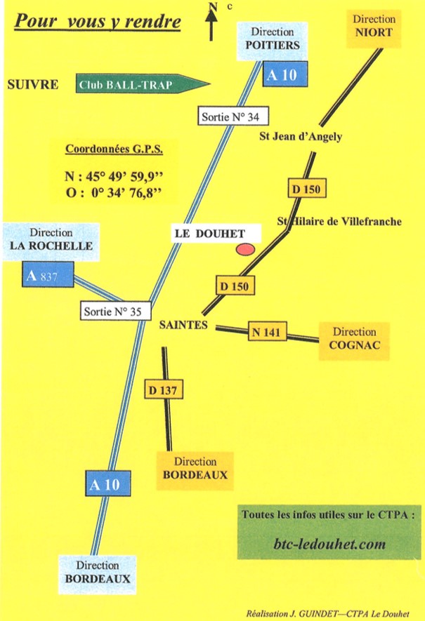 The Clay Pigeon Shooting Club Le Douhet (CPSC Le Douhet) is located in the commune of Le Douhet (17100), 15 km north of Saintes and 17 km south of Saint-Jean d’Angély. Due to its wooded environment, clay pigeon shooting is primarily focused on the Hunting Course, but Compak Sporting can also be practiced.